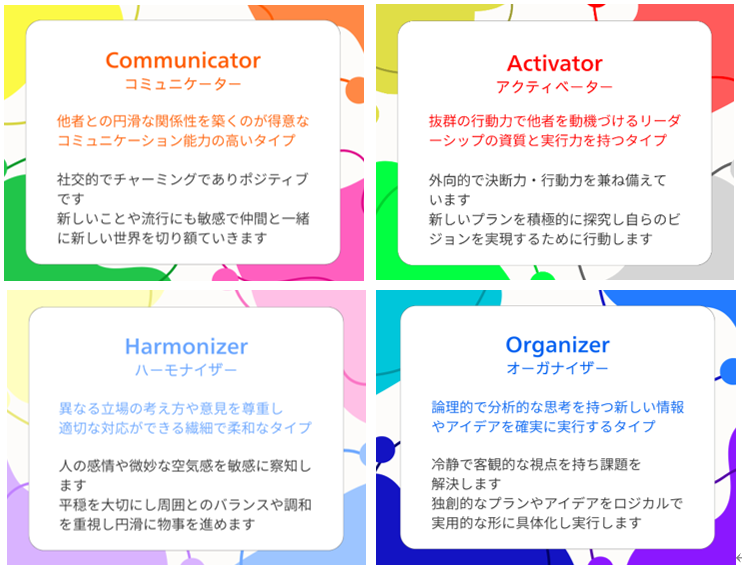 COLOR CODE4™では、コミュニケーター・アクティベーター・ハーモナイザー・オーガナイザーの4タイプを使って、
